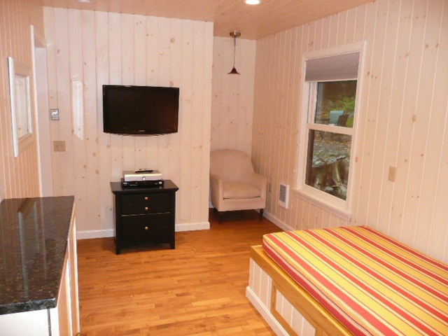 Open living/dining/kitchen combination with hand carved granite fireplace and cathedral ceiling which opens to deck, bedroom with king bed and gas woodstove, bedroom with two twin beds, and a bath with large shower.